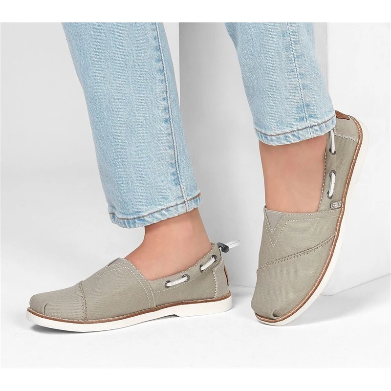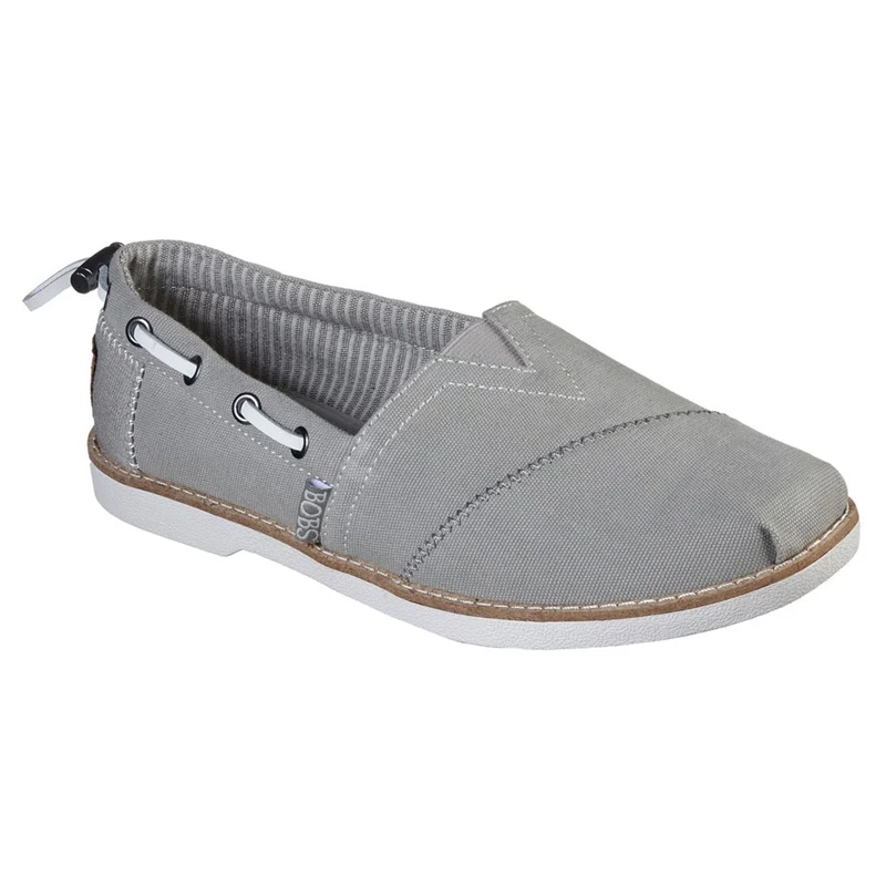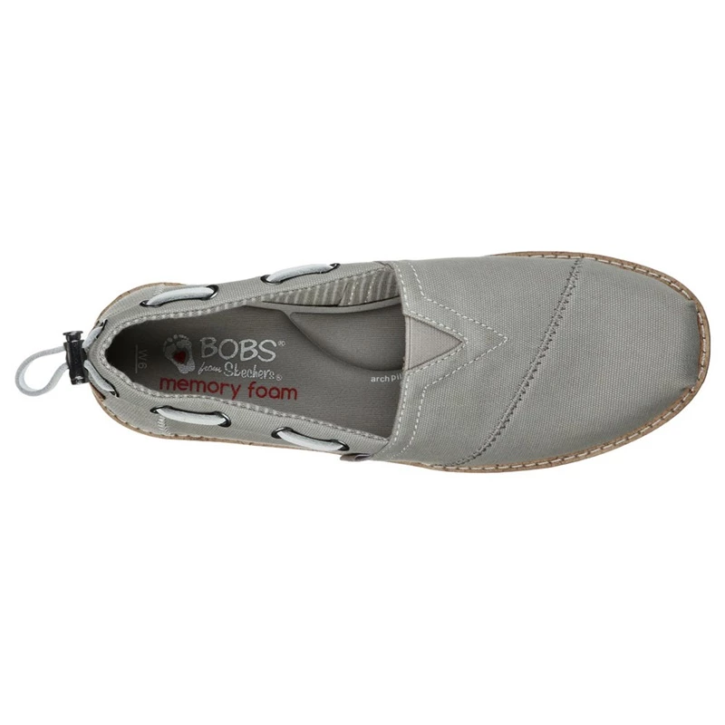 Soft woven canvas fabric upper.Slip on casual alpargata flat design.Contrast colored stitching accents.Smooth soft canvas with solid color finish.Tucked toe pleat front.Diagonal stitched seam accent on front panel.Heel panel overlay.Side and heel BOBS logo labels.Top elastic panel for easy fit.Cinchable collar design with metal eyelets.Slide lock at heel for precise fit.Soft stripe patterned fabric shoe lining.Memory Foam cushioned comfort insole.Stitch accented topsole trim, contrast colored outsole.Cushioned midsole.Flexible rubber crepe textured traction outsole.1/3 inch built in heel.BOBS helps make a difference for animals and kids.Learn more about Skechers’ donations to animals and children in need here