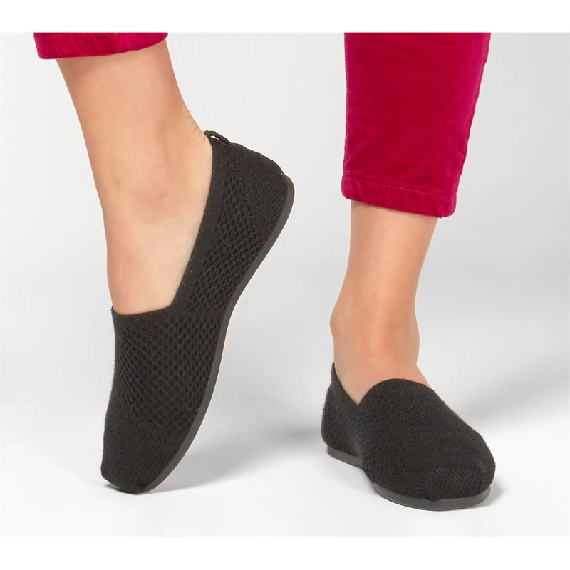 Skech Knit Mesh soft woven fabric upper.Knit-in openwork texture mesh design.Breathable design with openwork panels.Slip on casual alpargata flat design.Stitching accents.Tucked toe pleat front.Diagonal woven-in front detail.Heel solid colored fabric overlay panel.Top pull on loop heel.BOBS logo label on side panel.Stretch knit collar and front panel for easy slip on fit.Soft fabric shoe lining.Memory Foam cushioned comfort insole.Flexible rubber traction outsole.1/4 inch heel.BOBS helps make a difference for animals and kids.Learn more about Skechers’ donations to animals and children in need here