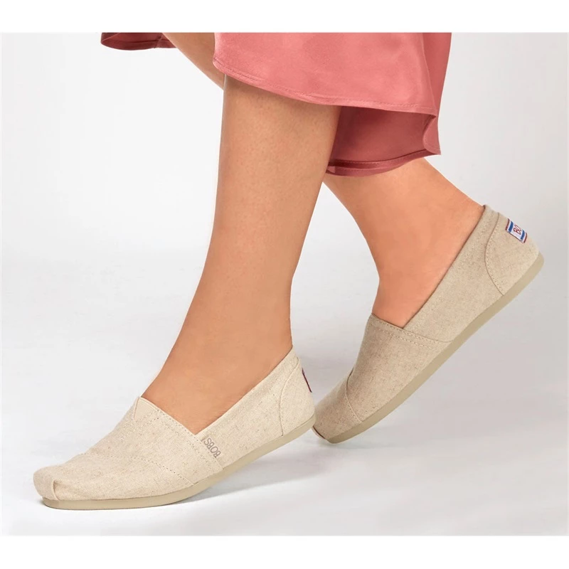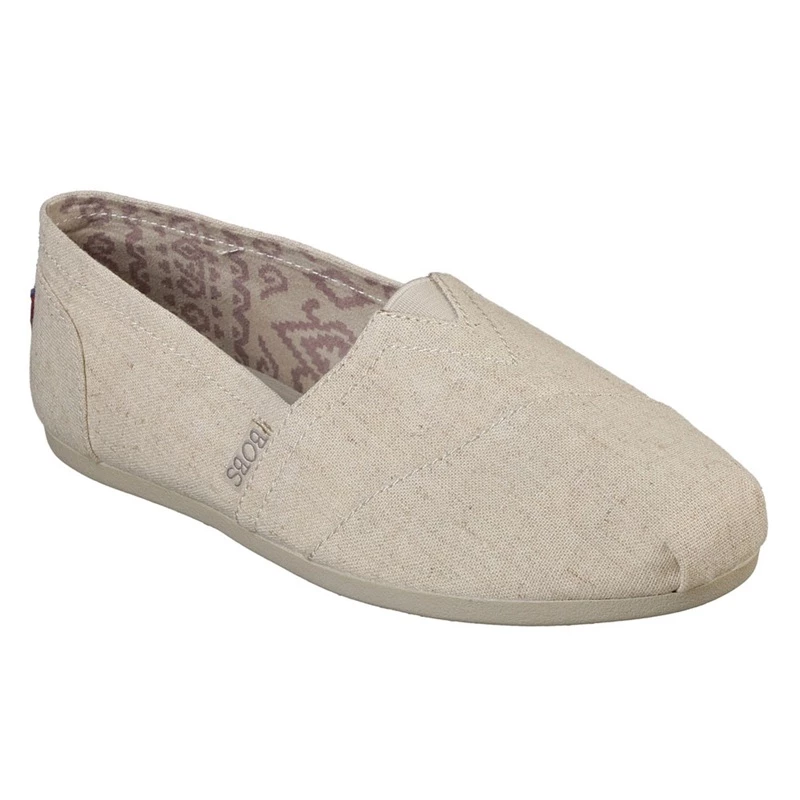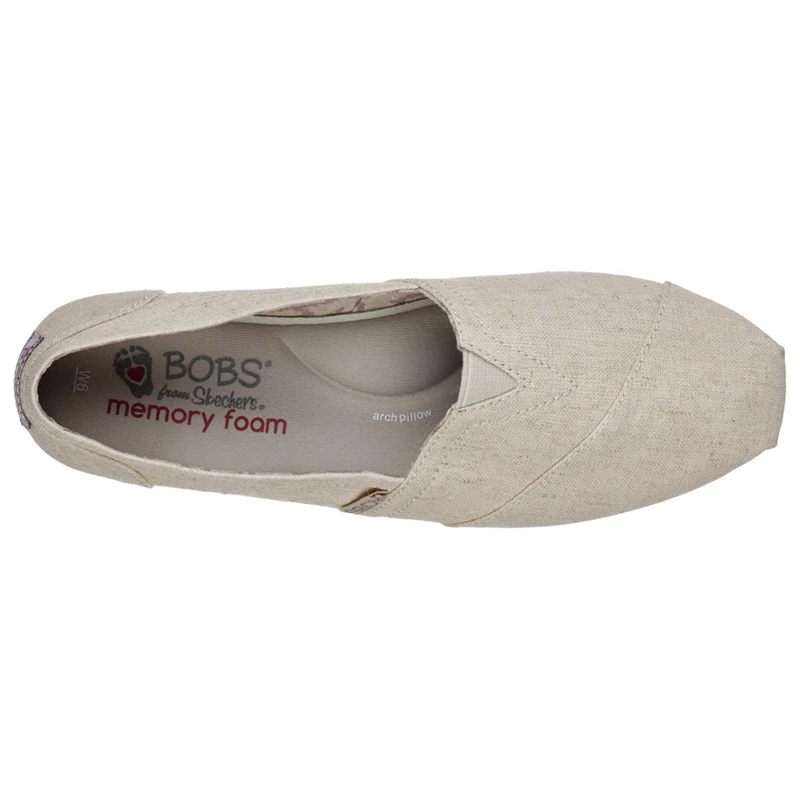 Soft woven natural finish linen fabric upper.Slip on casual alpargata flat design.Solid color upper.Stitching accents.Tucked toe pleat front.Heel panel overlay.BOBS logo side and heel labels.Top elastic fabric panel.Stitched collar trim.Soft fabric shoe lining.Memory Foam cushioned comfort insole.Shock absorbing midsole.Flexible rubber traction outsole.1/4 inch heel height.BOBS helps make a difference for animals and kids.Learn more about Skechers’ donations to animals and children in need here
