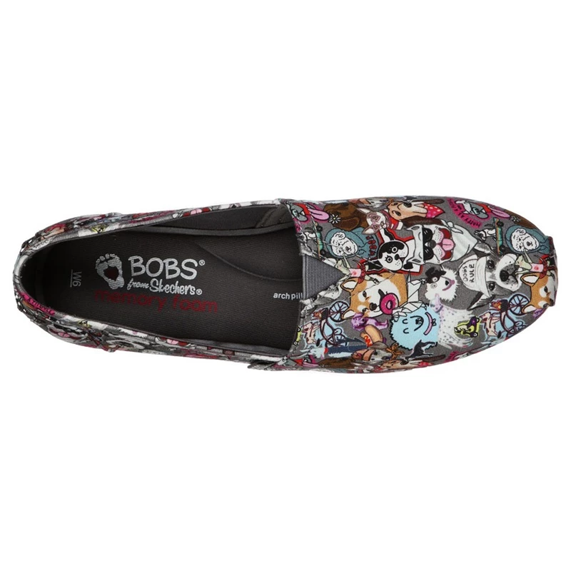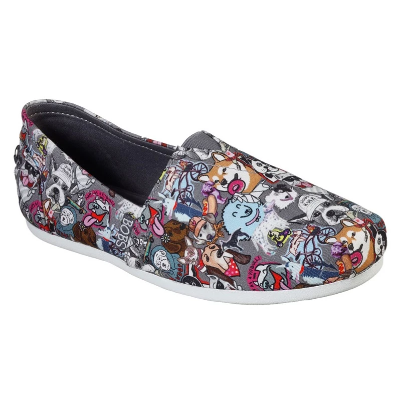 Smooth soft canvas fabric upper.Colorful multi-pattern ‘Doggone Collage’ dog print design.’Greatest Hits’ design with lots of different doggy elements and fun detailing.Slip on casual alpargata flat design.Stitching accents.Tucked toe pleat front.Diagonal stitched seam front detail.Heel fabric overlay panel.’BOBS for Dogs’ logo detail on heel.Top elastic fabric panel for easy slip on fit.Soft fabric shoe lining.Memory Foam cushioned comfort insole.Flexible rubber traction outsole.1/4 inch heel.BOBS helps make a difference for animals and kids.Learn more about Skechers’ donations to animals and children in need here