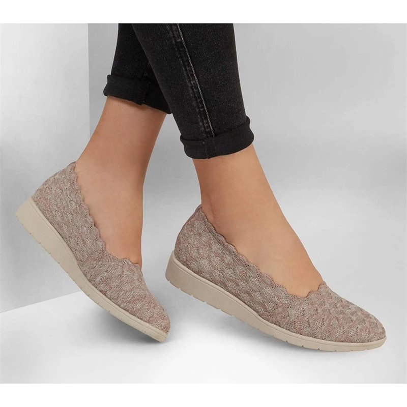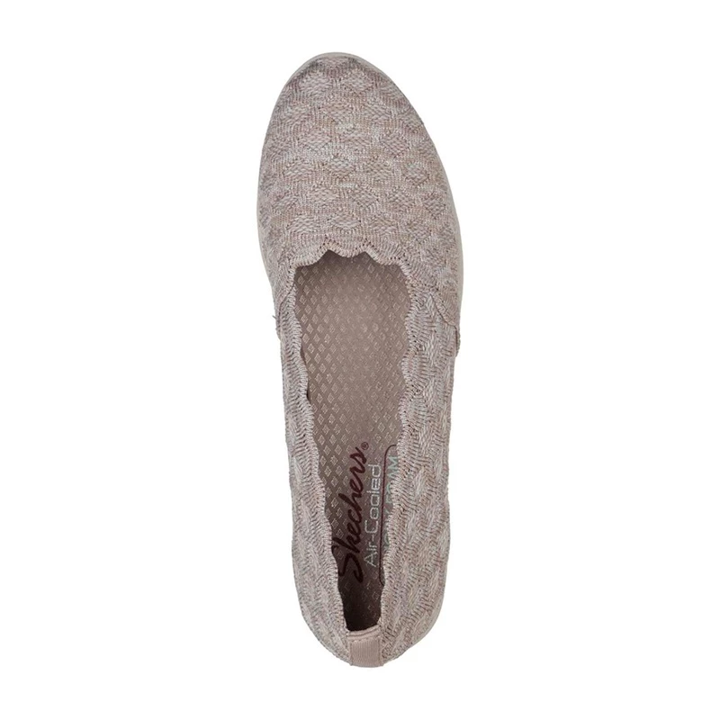 Lovable style arrives with updated comfort in Cleo; Flex Wedge – Endearment. This Stretch Fit; skimmer flat features a heathered honeycomb texture knit upper with scalloped trim, cushioned Air-Cooled Memory Foam; insole and a low wedge heel.