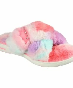 Chillout in laid-back comfort with GO Lounge; Arch Fit; Lounge – Excite. This tie-dye faux-fur slide sandal features a crisscross vamp with a buckle accent, supportive Arch Fit; comfort footbed and lightweight ULTRA GO; cushioned midsole.