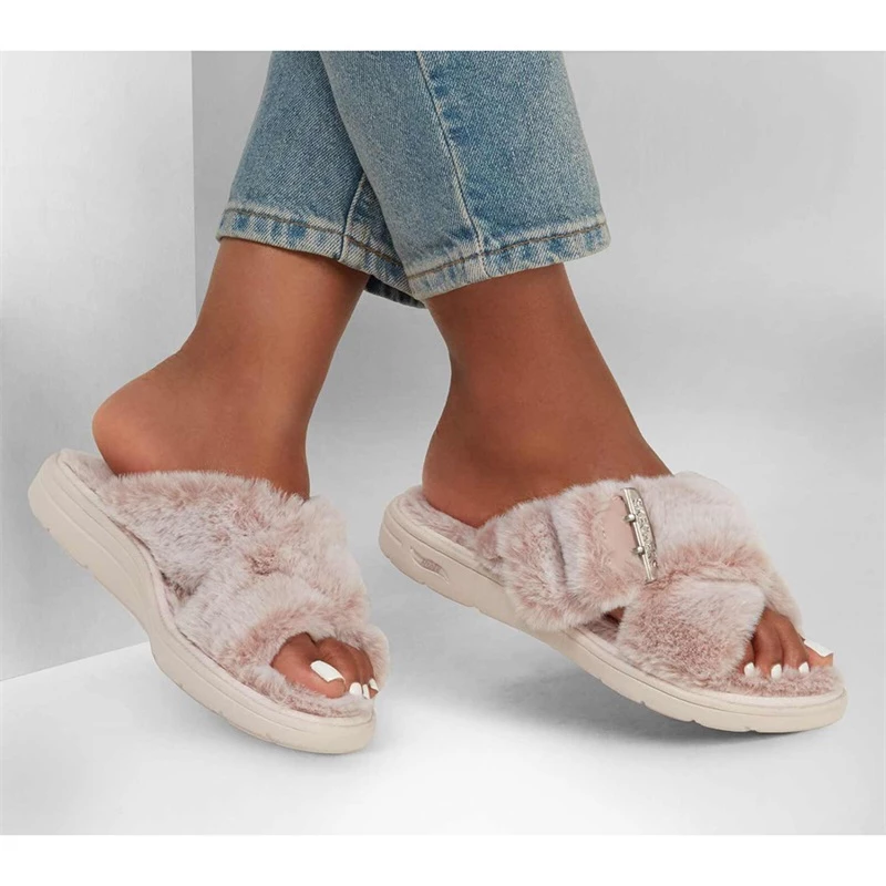 Enjoy cozy blissful comfort wearing GO Lounge; Arch Fit; Lounge – Serenity. This faux-fur slide sandal features a crisscross vamp with a buckle accent, supportive Arch Fit; comfort footbed and lightweight ULTRA GO; cushioned midsole.