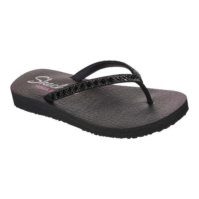 Get the top score for sunny sparkle with Cali; Meditation – Perfect 10. This casual flip flop thong style features a woven fabric upper with rhinestone accents, plus Yoga Foam comfort footbed.