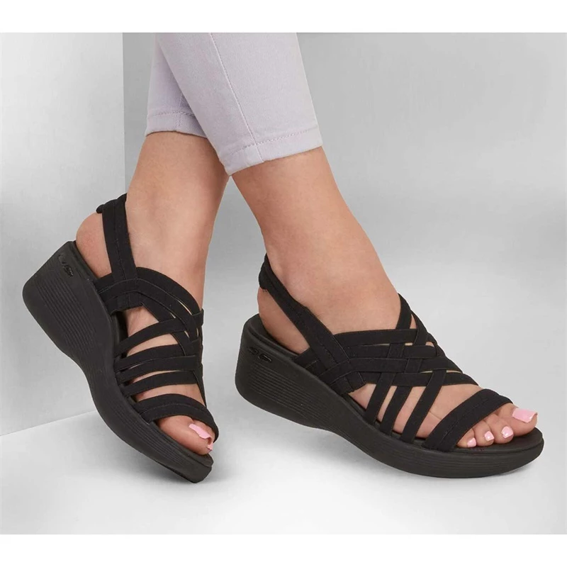 Combine stretch comfort with the perfect height in the Pier-Lite sandal. Soft stretch fabric upper in a strappy slingback sandal with a Luxe Foam comfort footbed and lightweight wedge heel.
