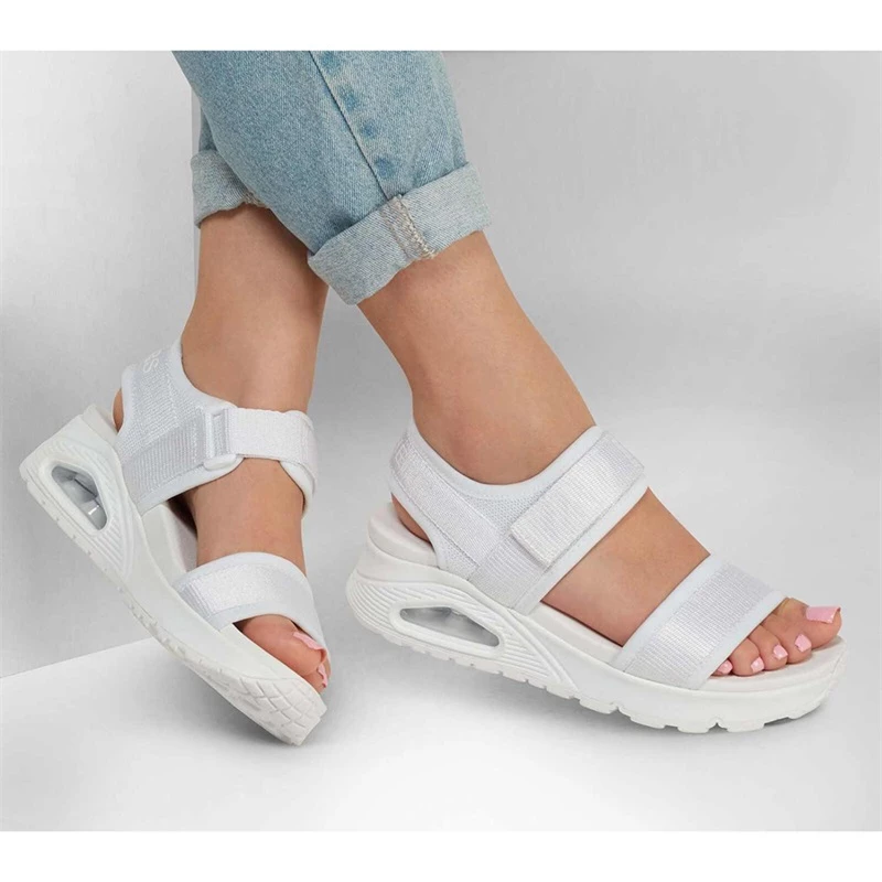 A favorite style gets a warm-weather update in the Street; Uno – New Sesh sandal. This strappy fashion sandal features a synthetic strap upper with a hook and loop closure, Yoga Foam comfort footbed and a platform wedge with visible Skech-Air air-cushioned midsole.
